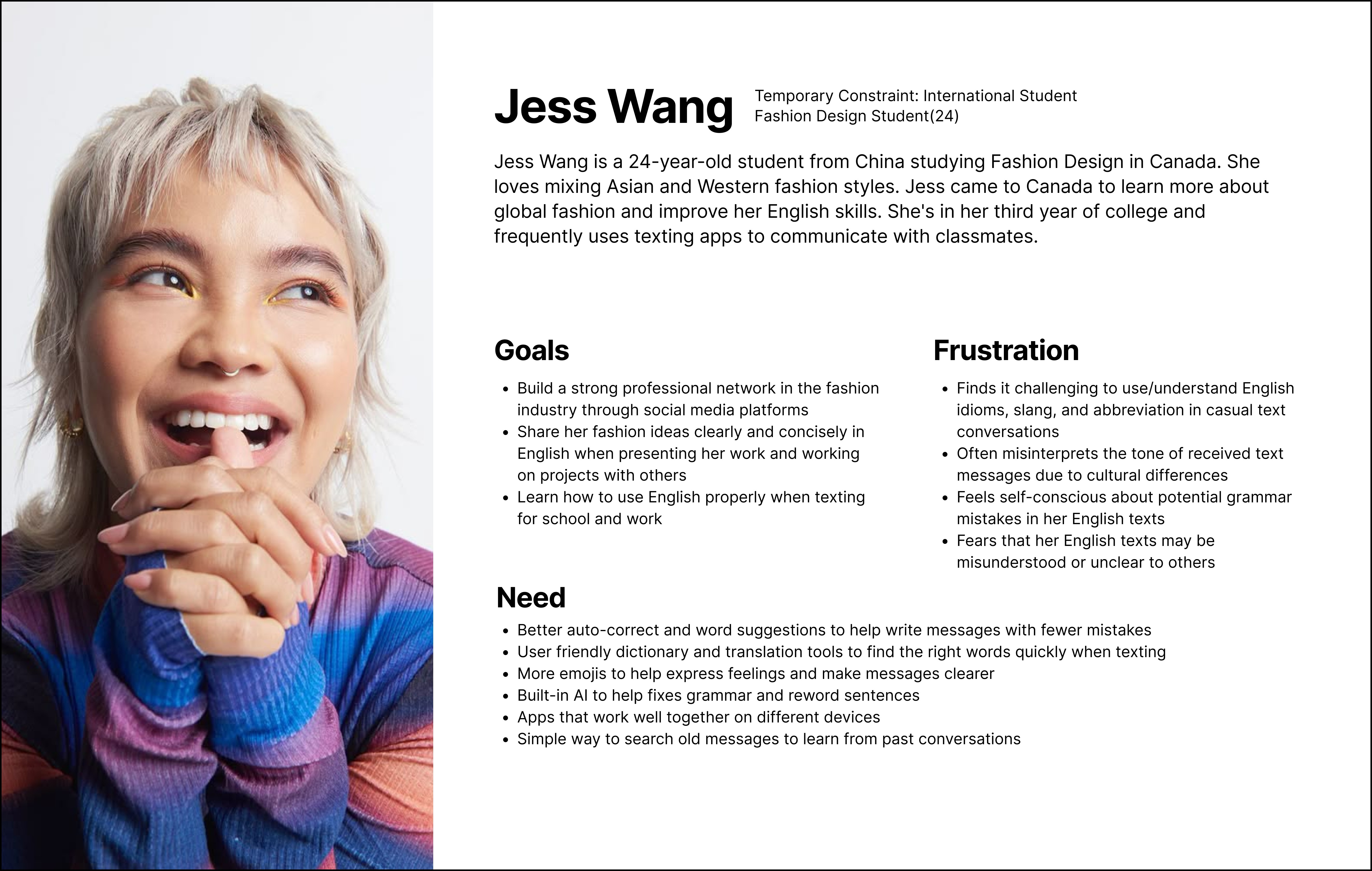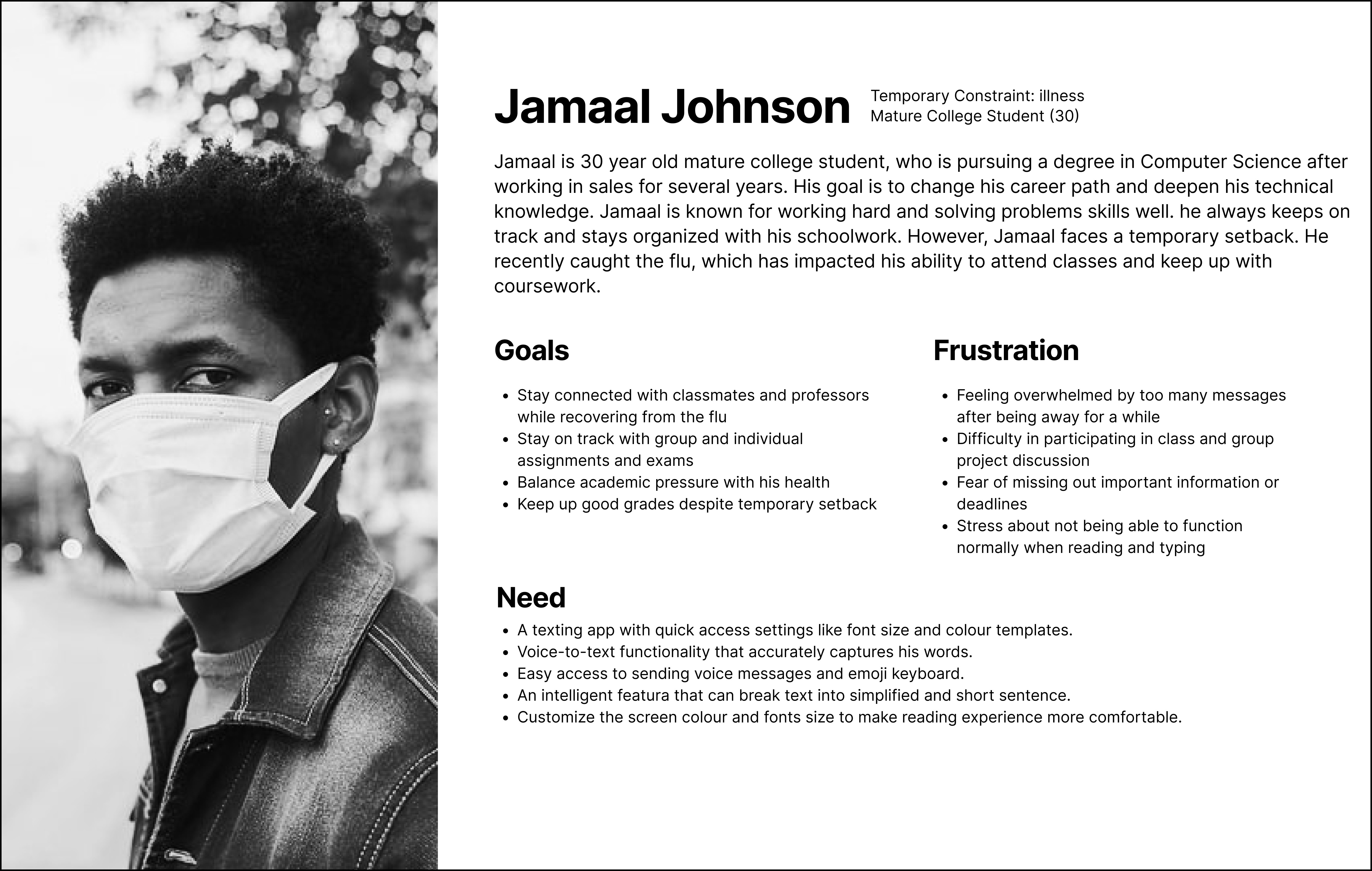 Instead of creating traditional persona, I created Personas Spectrum represent three types of constraints: permanent (dyslexia), temporary (illness or fatigue), and situational (language barrier/multitasking).