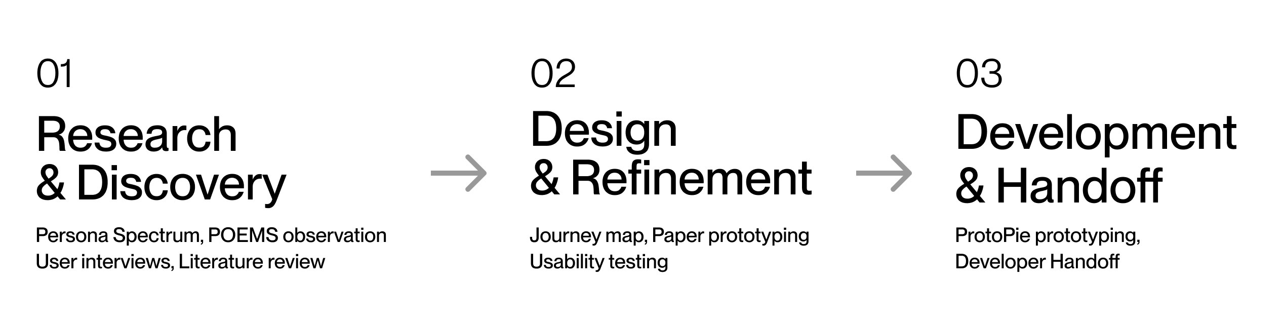 Research, User interviews and observations, Persona Spectrum, Journey mapping, Paper prototyping, Usability testing, UI style guides, High-fidelity prototypes in ProtoPie