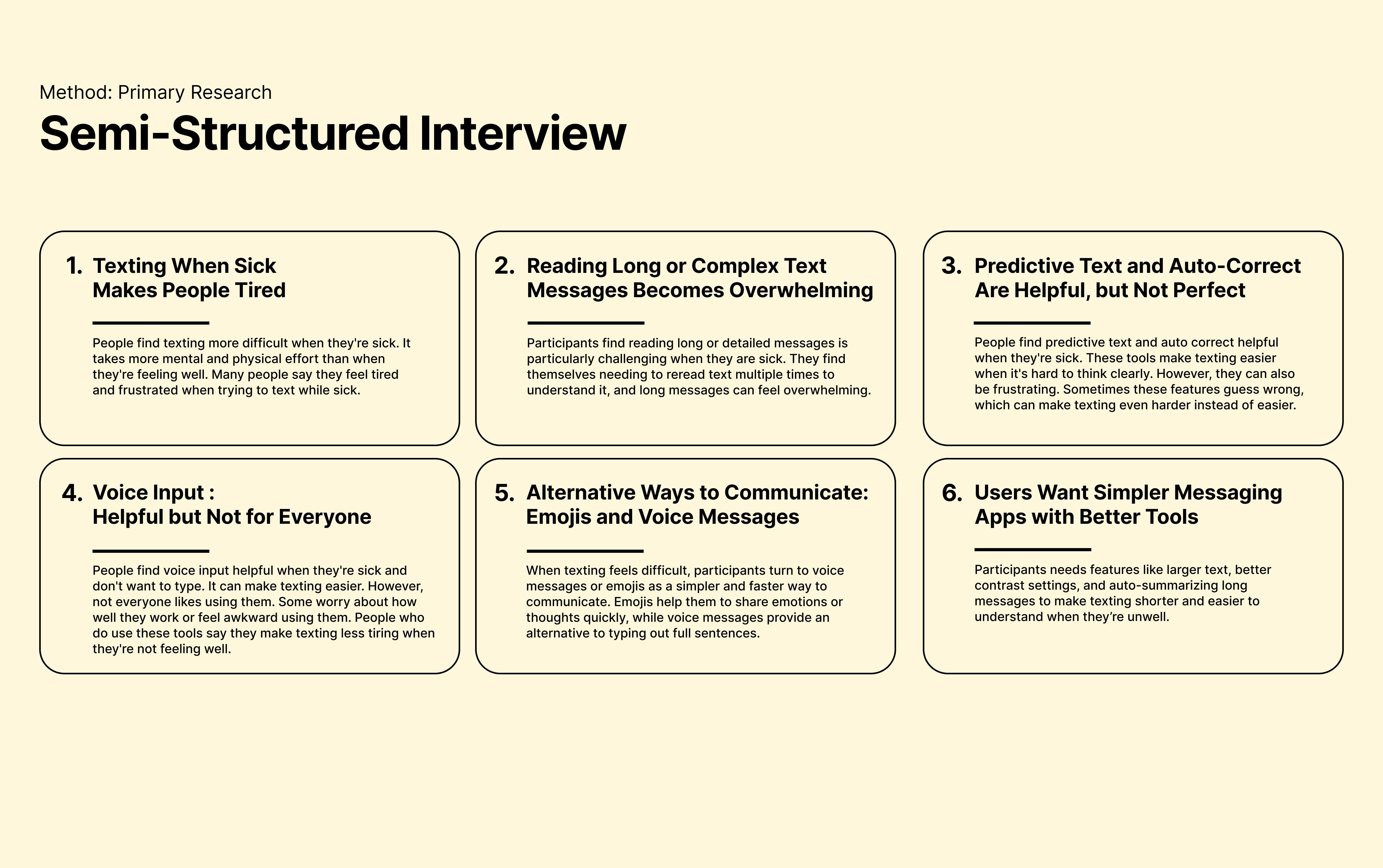 Mapped common texting scenarios to understand user goals, pain points, emotions, and moments of friction. This helped identify where summary and emoji support could be most helpful.